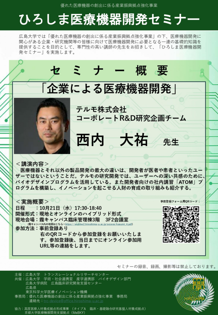 【2025/10/21】ひろしま医療機器開発セミナー 西内 大祐先生 「企業による医療機器開発」